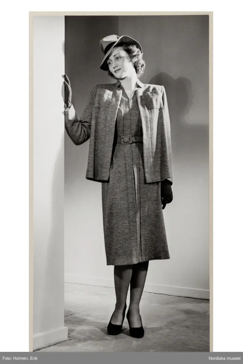 Mannekäng visar plagg i provrum. Klänning, med liten v-ringning, knälång. Mitt fram sydda dekorativa veck. Rak, höftlång jacka med markerade axlar och bröstfickor. Hatt, handskar och pumps. NK:s Franska damskrädderi.