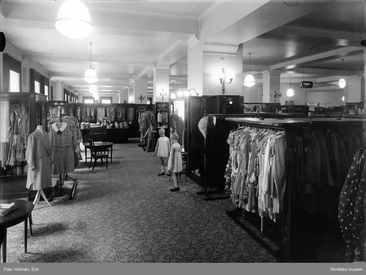 Interiör från Nordiska Kompaniet. Flickkonfektion. Provdockor, klänningar, hattar, speglar, bord och klädhästar.
