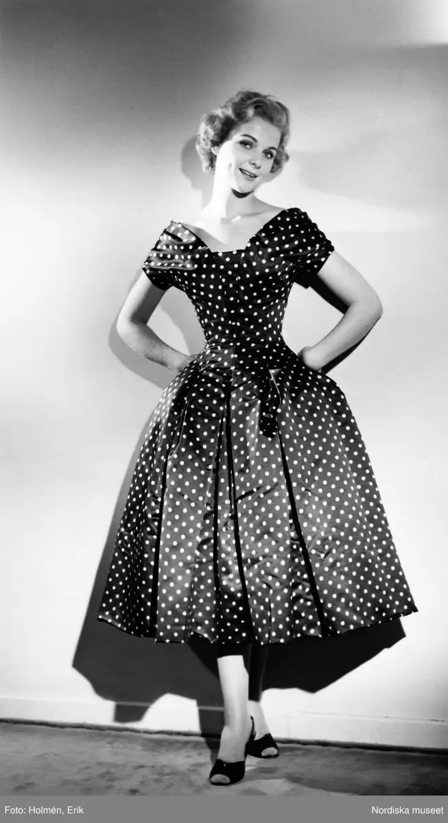 Modell i prickig klänning från NK:s franska damskrädderi. Original från Dior.