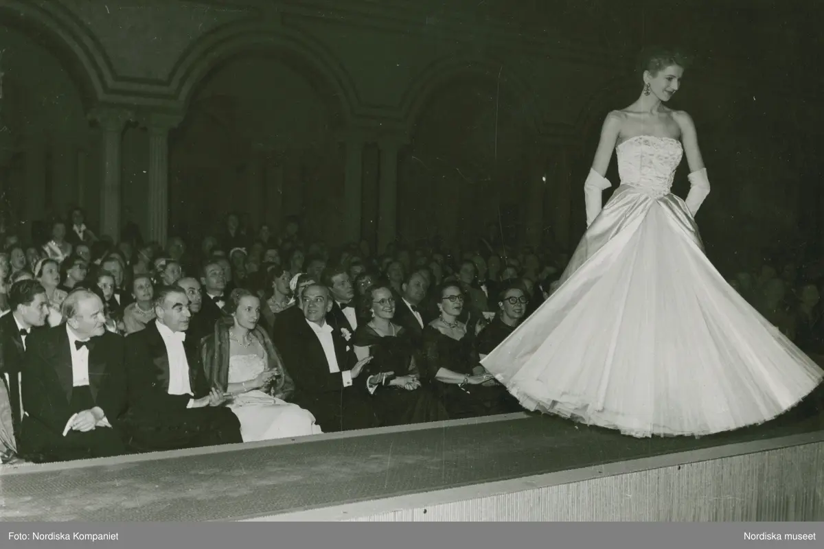 Modegala på Stadshuset, "Italiana". Modell i balklänning, örhängen och operahandskar framför publik.