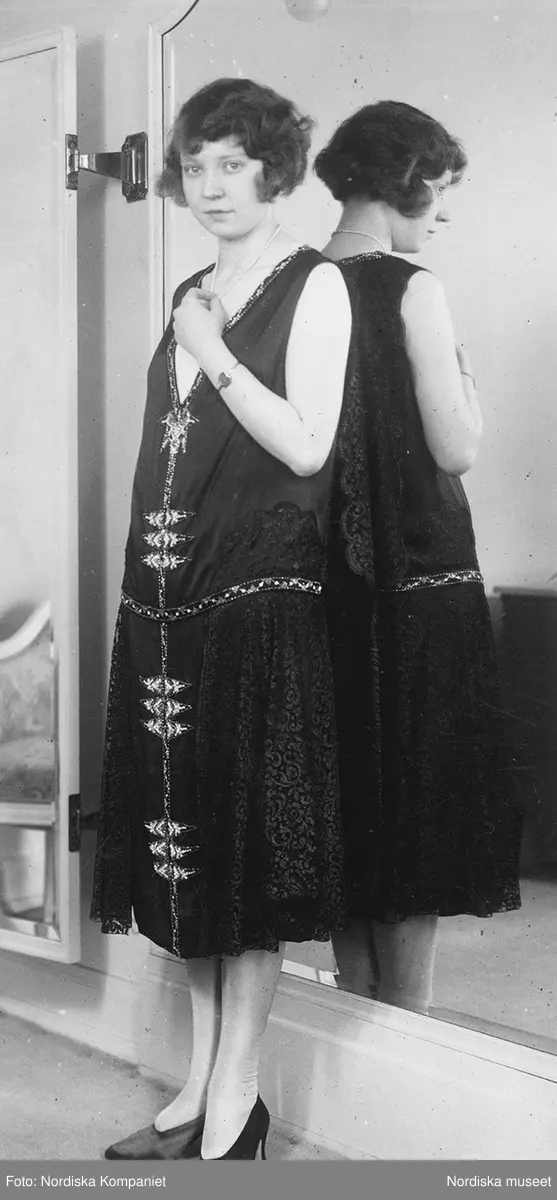 Modell i spets- och sidenklänning med silverfärgade dekorationer, pumps och halsband, framför spegel.