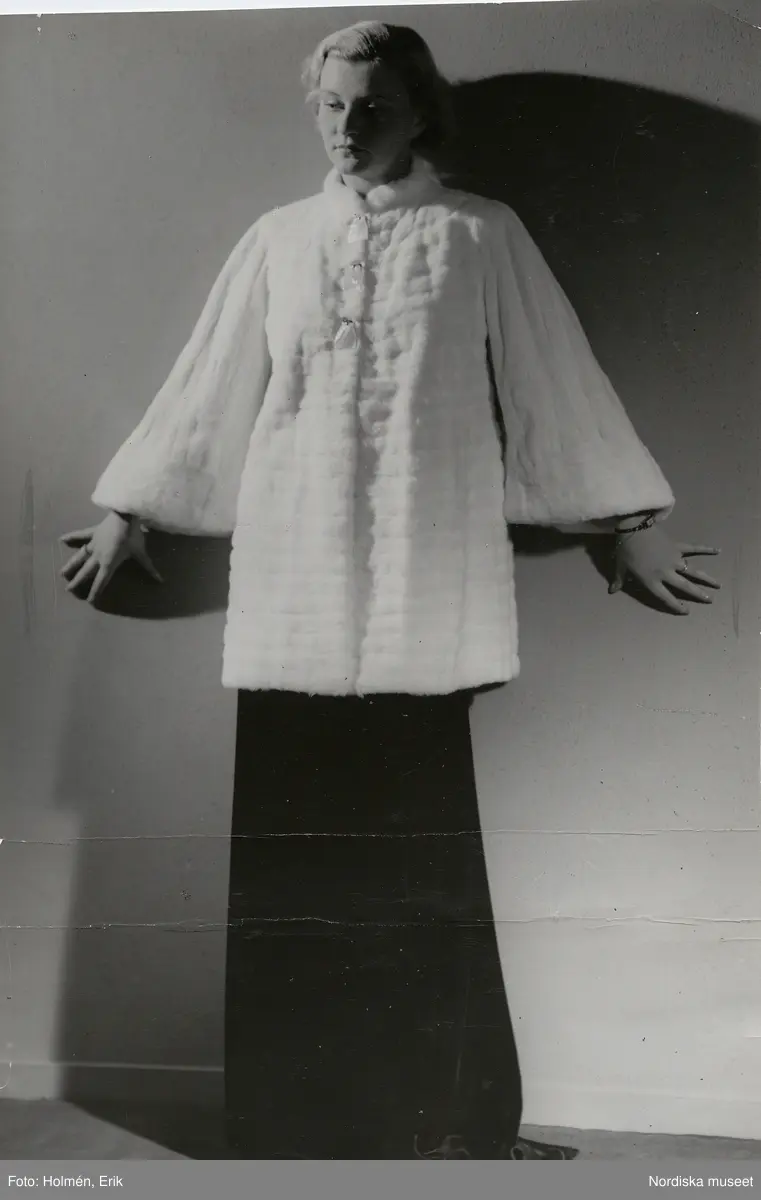 Nordiska Kompaniet. Kvinna i mörk aftonklänning och vit pälsjacka av hermelin. Text på baksidan: "Vit hermelin"