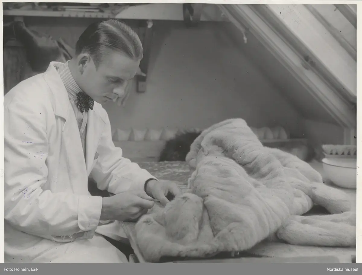 I pälsateljén på Nordiska Kompaniet. Körsnär i vit arbetsrock och skjorta arbetar med en päls.