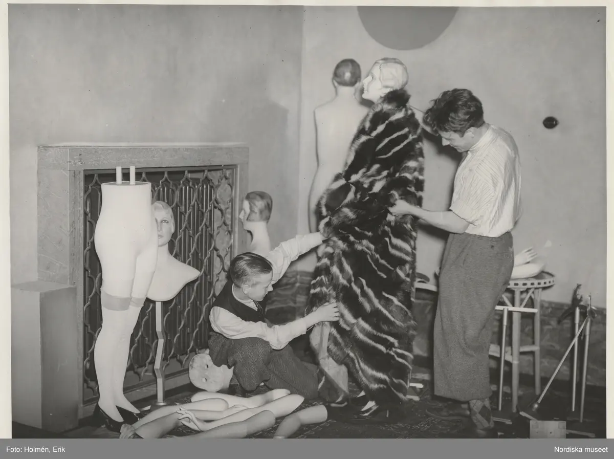 I pälsateljén. Föreberedelser till pälsutställning i Ostmans bilhall. Två män klär på pälskappa på skyltdocka.