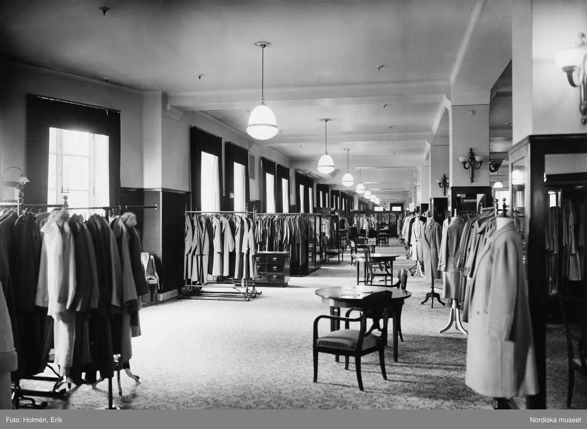 Interiör från E-sektionen på Nordiska Kompaniet. Kappor hänger på klädhästar och provdockor. I mitten står stolar och runda bord. Heltäckningsmatta på golvet.