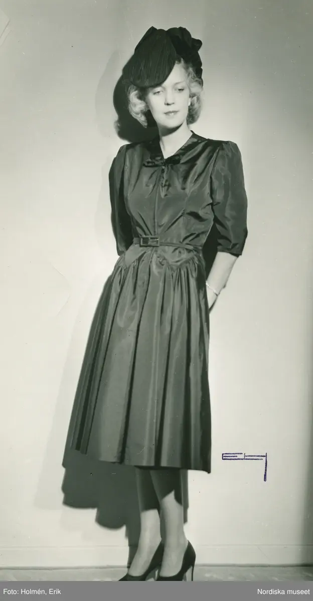 Helporträtt av kvinna i klänning av Robert Piguet och hatt.