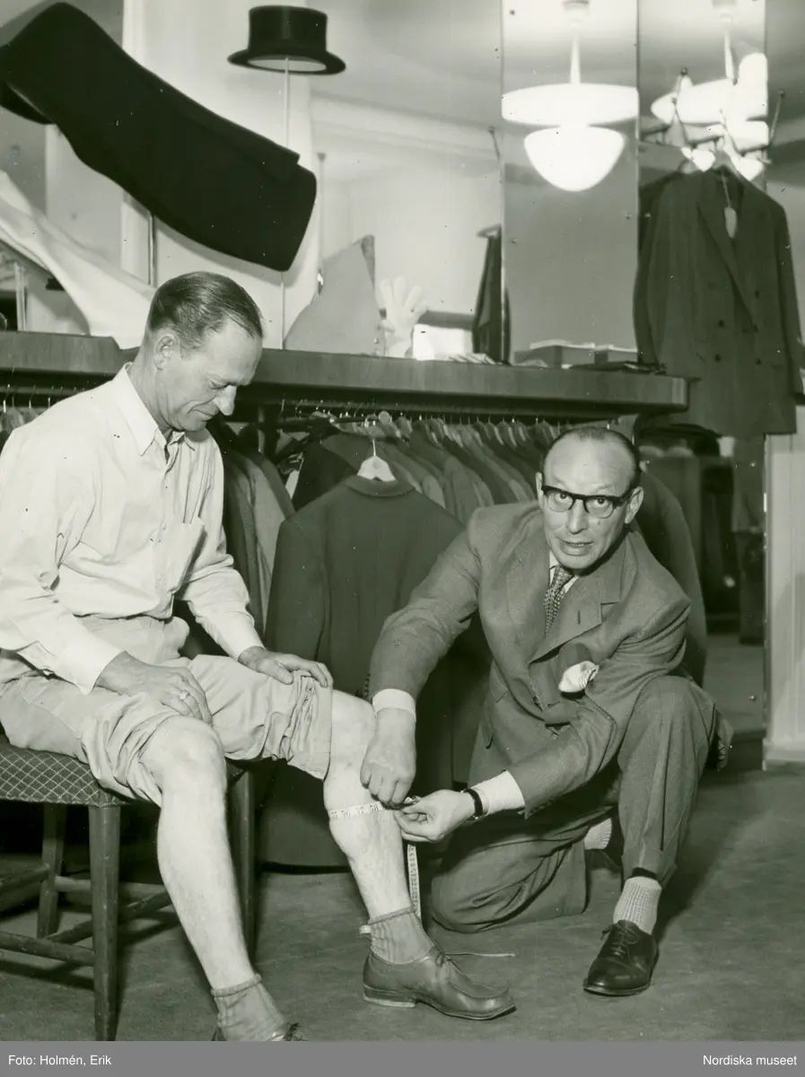 En försäljare tar mått på en man på Nordiska Kompaniets herrkonfektionsavdelning.