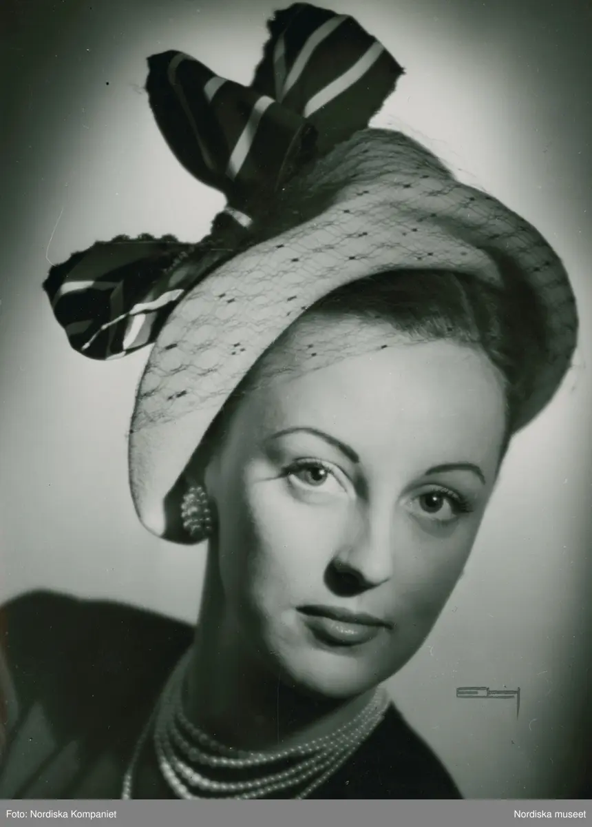 Modell, möjligen Hjördis Grundel-Starenius, i hatt med låg kulle, uppvikt brätte. Randig rosett och flor.