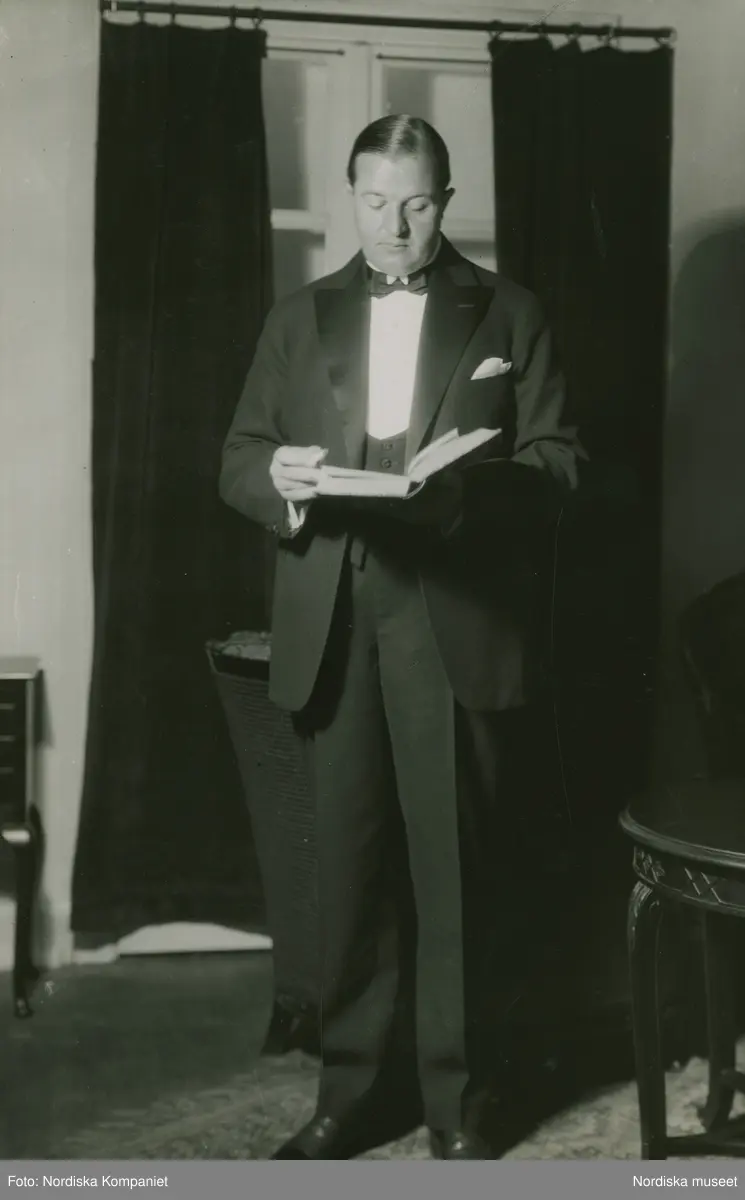 Man i smoking. Framför sig håller han en uppslagen bok och en cigarett. Nordiska Kompaniet. Text med blyerts på baksidan: "GB Sept 1929 Engelska Herrskrädderiet div. bilder"