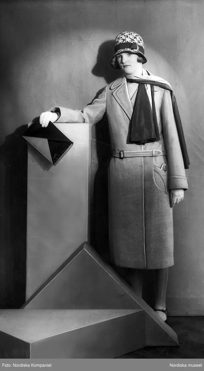 Modell i kappa, scarf, klockhatt och kuvertväska med trekantsmönster, lutar sig mot rekvisita.