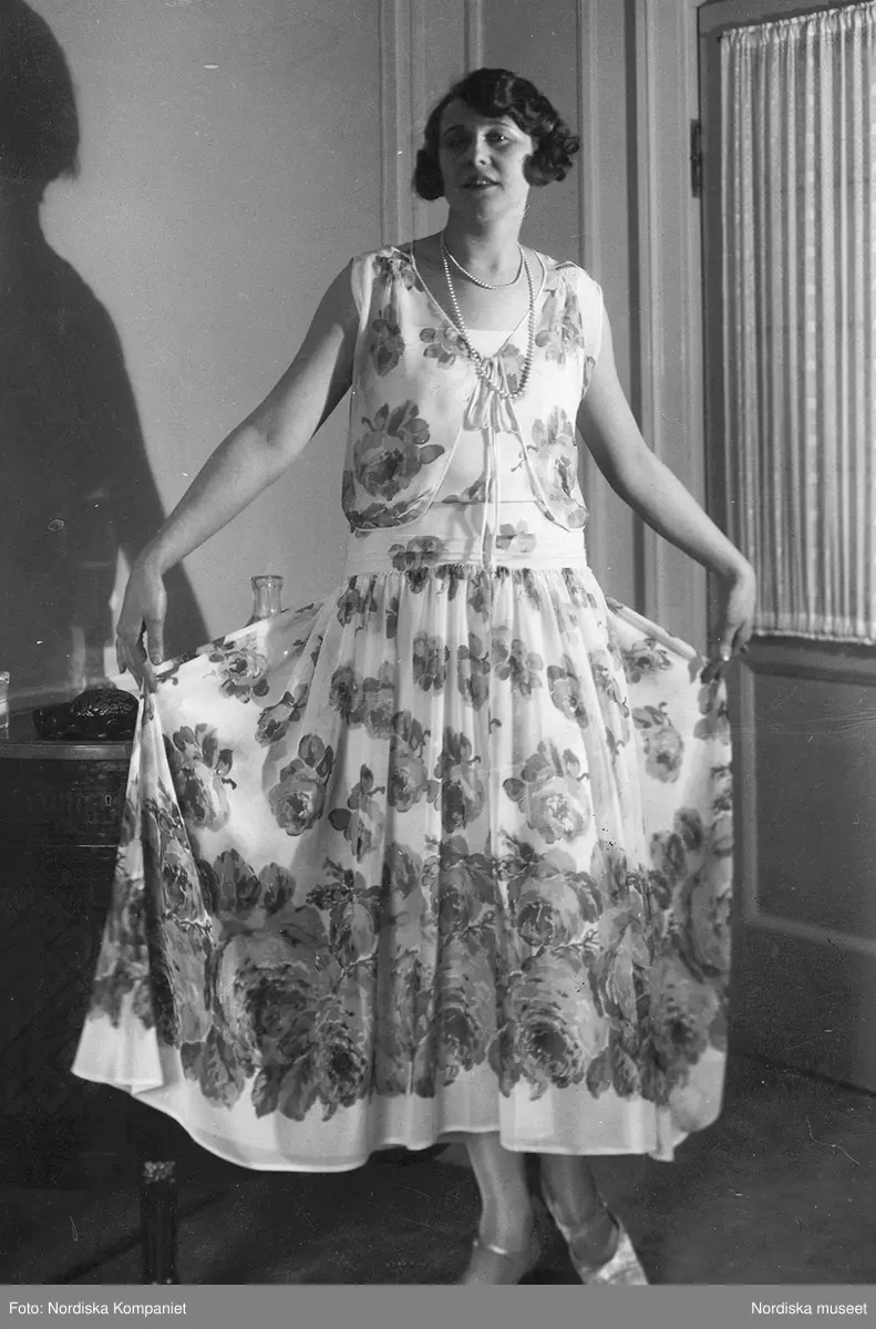Modell i blommig klänning av tryckt crêpe-georgette med väst och halsband, håller upp kjolen. Från Louise Boulanger.