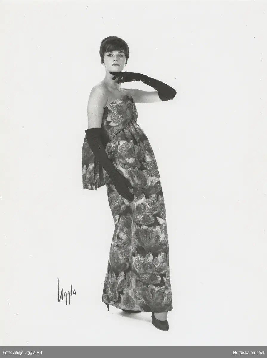 Mannekäng i aftonklänning med grönblommig brokad. NK:s Franska damskrädderi efter Balenciaga.