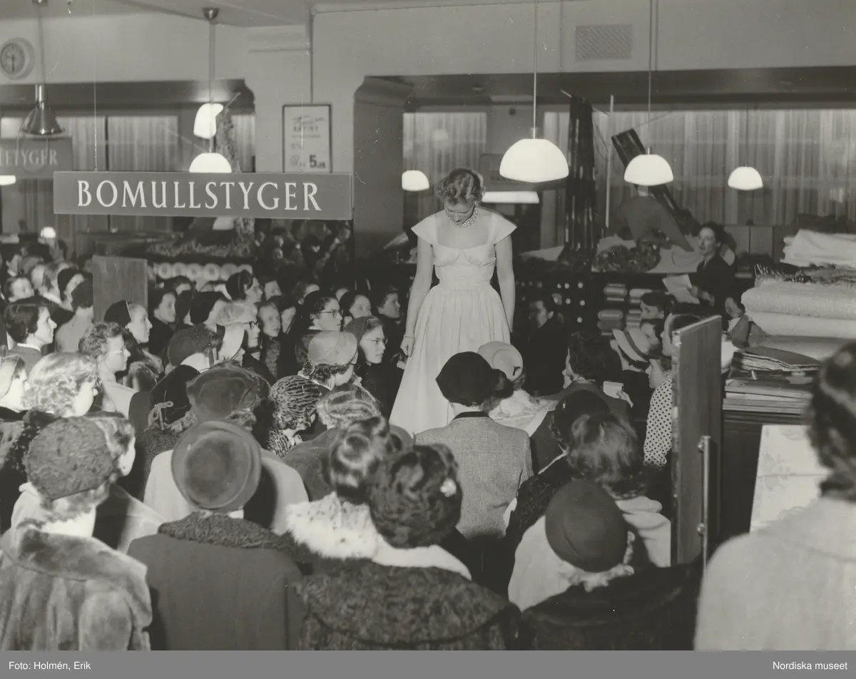 Visning på Nordiska Kompaniet. Modell i vit bomullsklänning framför publik. Kursverksamhet.