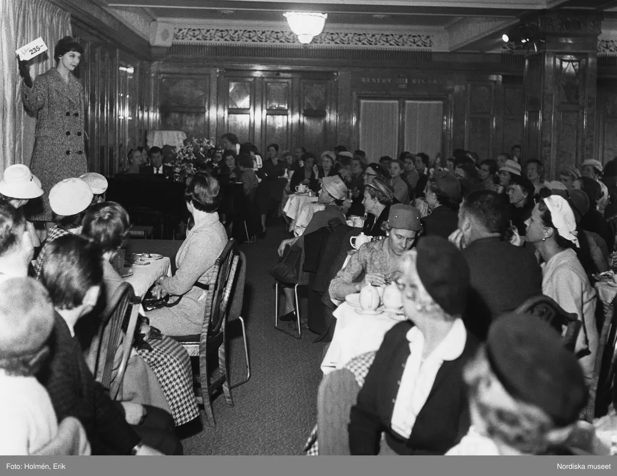 Modell klädd i dubbelknäppt yllekappa, hatt och handskar står på ett podie. Modellen håller upp en skylt med texten 235:-. Publiken sitter vid bord och följer visningen. De flesta kvinnorna i publiken bär hatt.