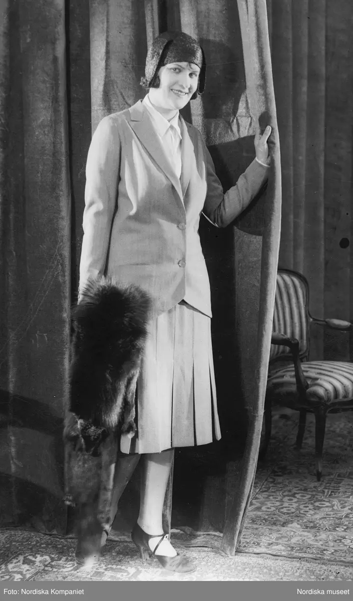 Modell i kavaj, veckad kjol och hatt, håller i en minkboa. Från Jean Patou.