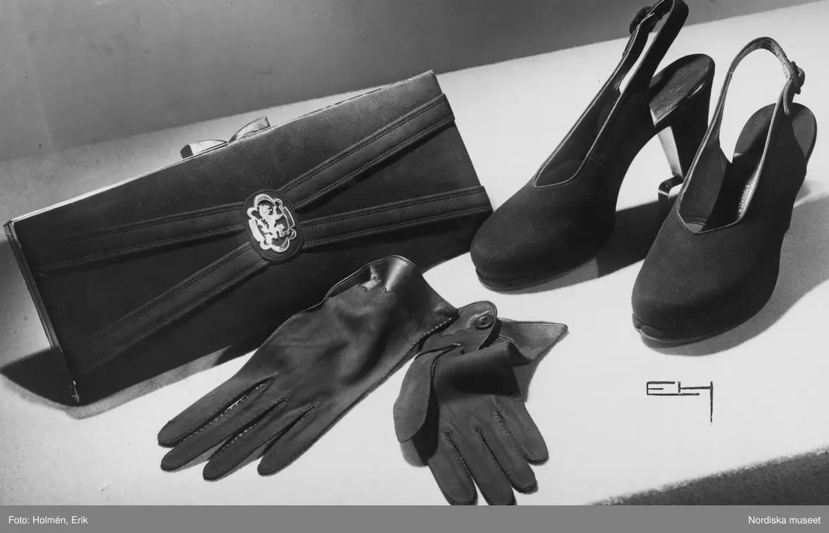 Ballyskor i mocka med platåsula, Argentinsk, långsmal, brun bygelväska med guld, samt ett par handskar.