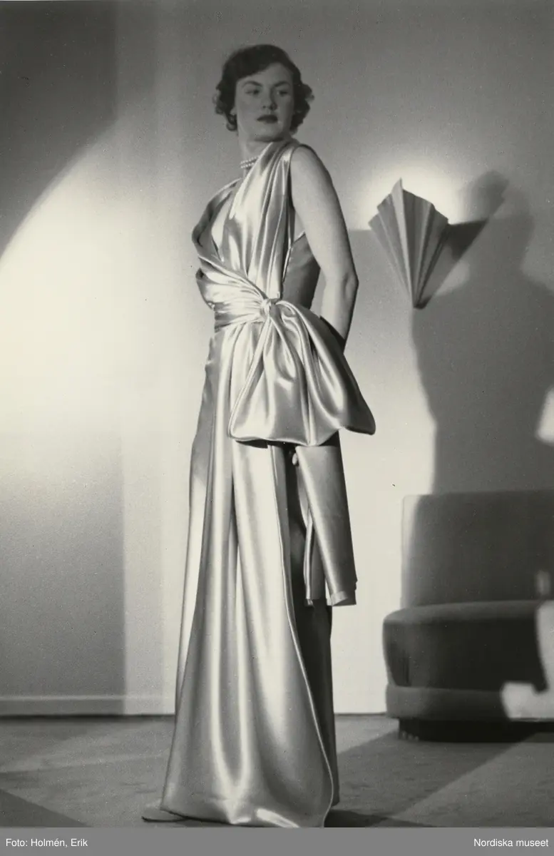 Nordiska Kompaniet. Kvinna i helång, ljus aftonklänning av blankt tyg. Stor rosett vid ena höften. Text på baksidan: "Mars 1949"
