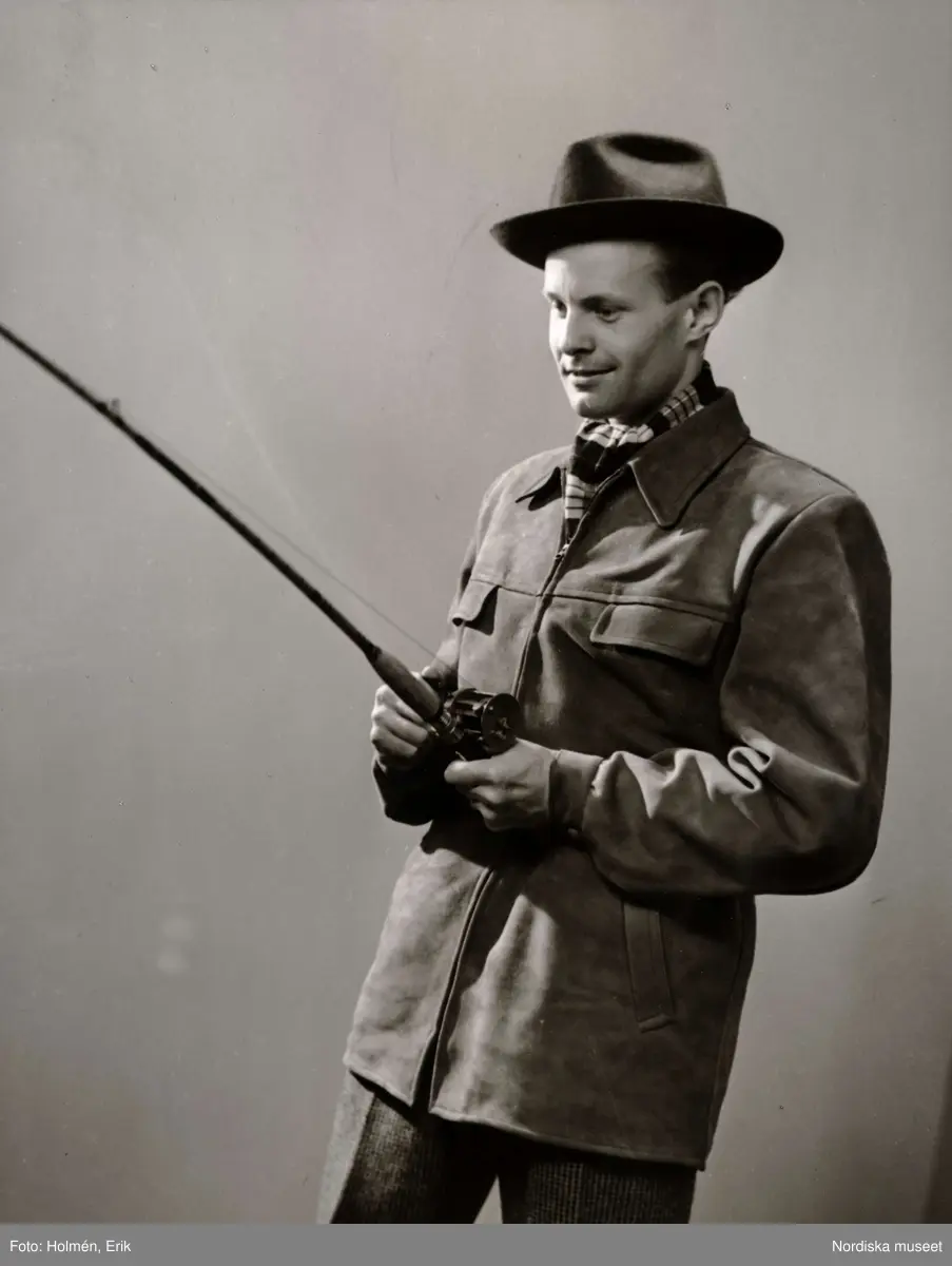 Manlig modell iklädd hatt och moccajacka från C. O. Ericson, Malung, håller i fiskespö. Lädermarknaden, Nordiska Kompaniet 1949,