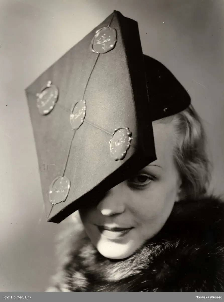 Hattmode från Talbot, Nordiska kompaniet. Hatt av grön filt med lackstämpel.
