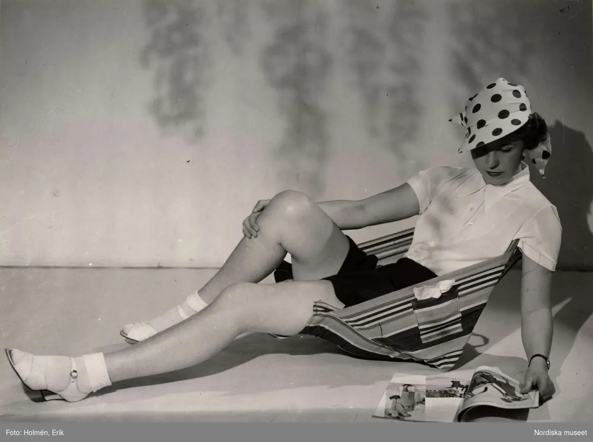 Titel: Sommarmode visas på varuhuset Nordiska Kompaniet i Stockholm 1936. En kvinnlig modell poserar, sittande i en randig strandstol av textil, iförd stranddräkt bestående av shorts, kortärmad blus och prickig keps med knytband. Hon bär nedvikta strumpor och remsandaletter. Modellen läser en tidning.