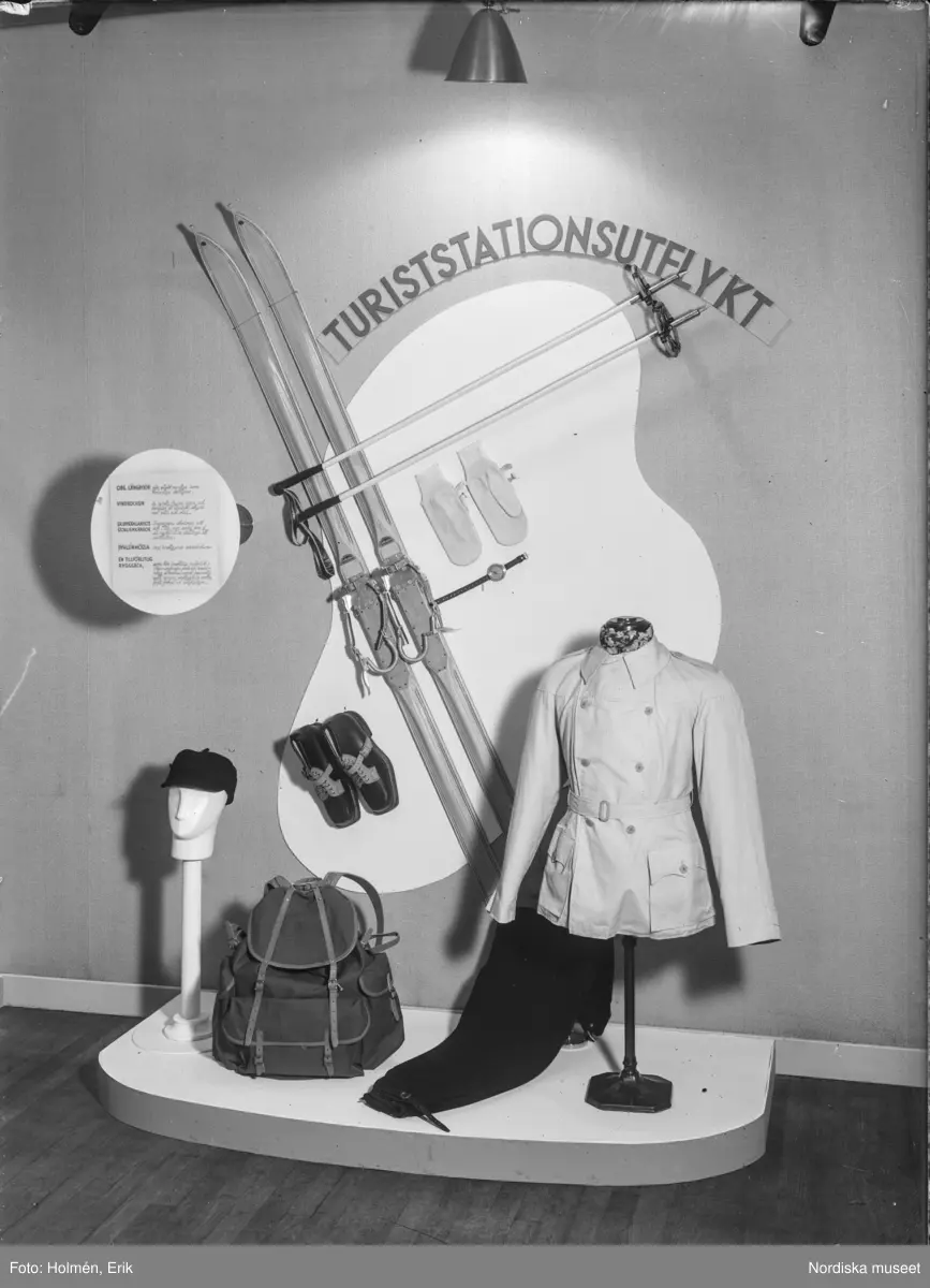 Fjällsportutställning på NK. Display med kläder och utrustning.