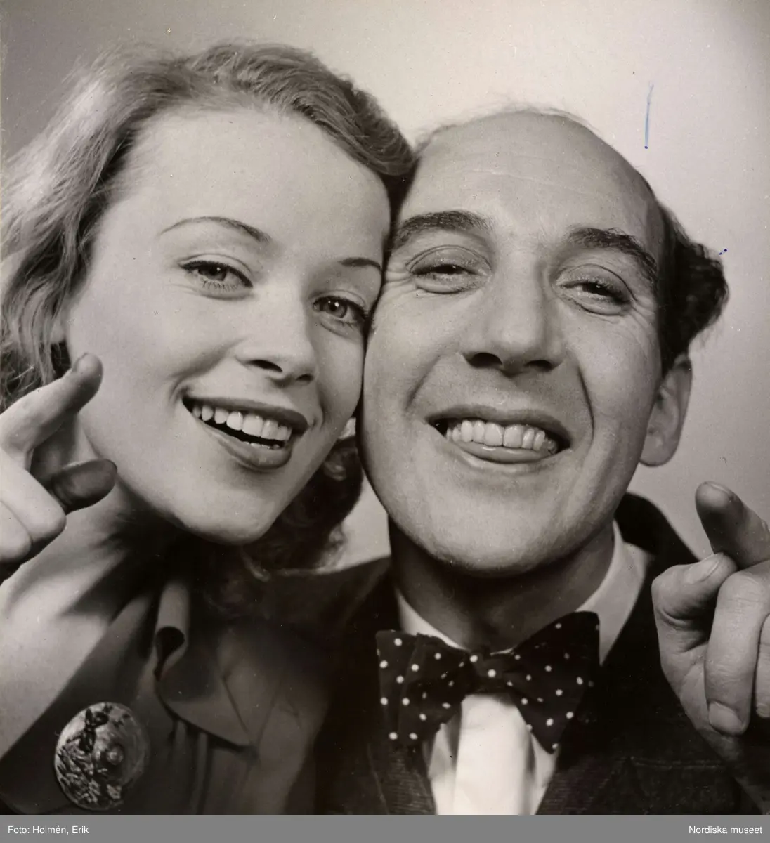 Reklamannons för Nordiska Kompaniets generalrea 1944. En man i kostym och fluga och en ung kvinna sedda framifrån, de står leende med huvudena tätt ihop.