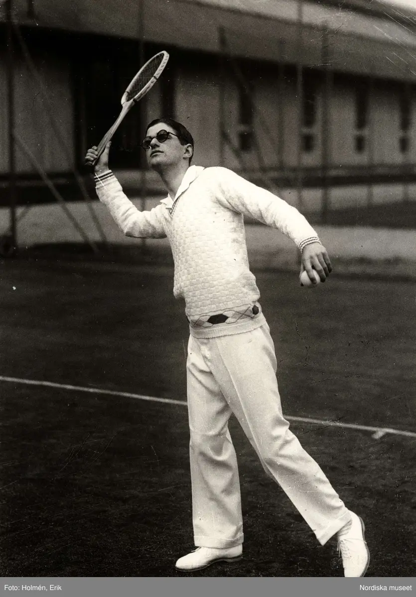 Nordiska Kompaniet visar tenniskläder oktober 1928. Ung man iförd tenniskläder och solglasögon svingar en tennisracket, i andra handen håller han en boll.