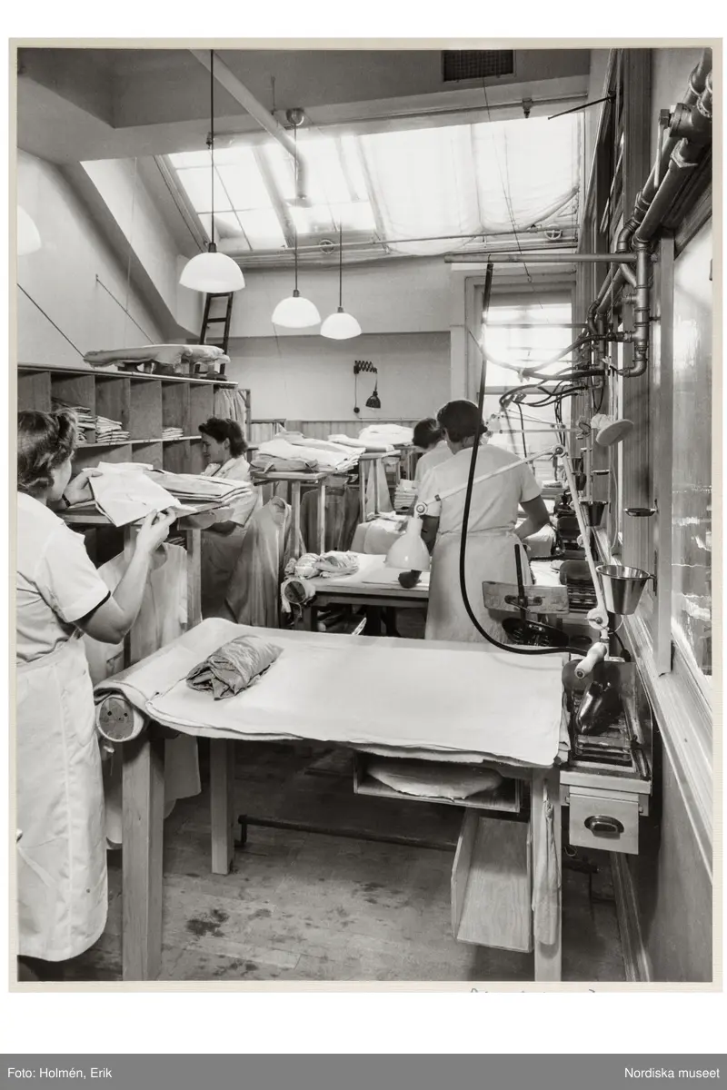 Beklädnadsateljéerna på NK (Nordiska Kompaniet). Vid Strykinrättningen arbetar kvinnor i vita rockar med strykning av färdiga plagg.
