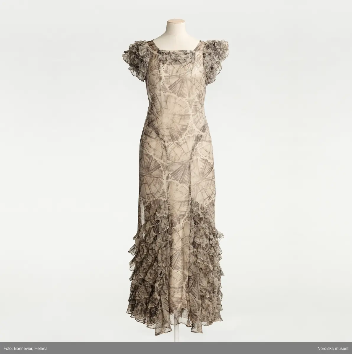 Transparent klänning av sidenorganza med abstrakt mönster. Den bars med en mauvefärgad underklänning, svarta pumps och krokodilväska. Beställd från NK:s Franska damskrädderi av modisten Stanny Berlin född Westberg (1893-1954). Troligen levererad under 1930-talet.
