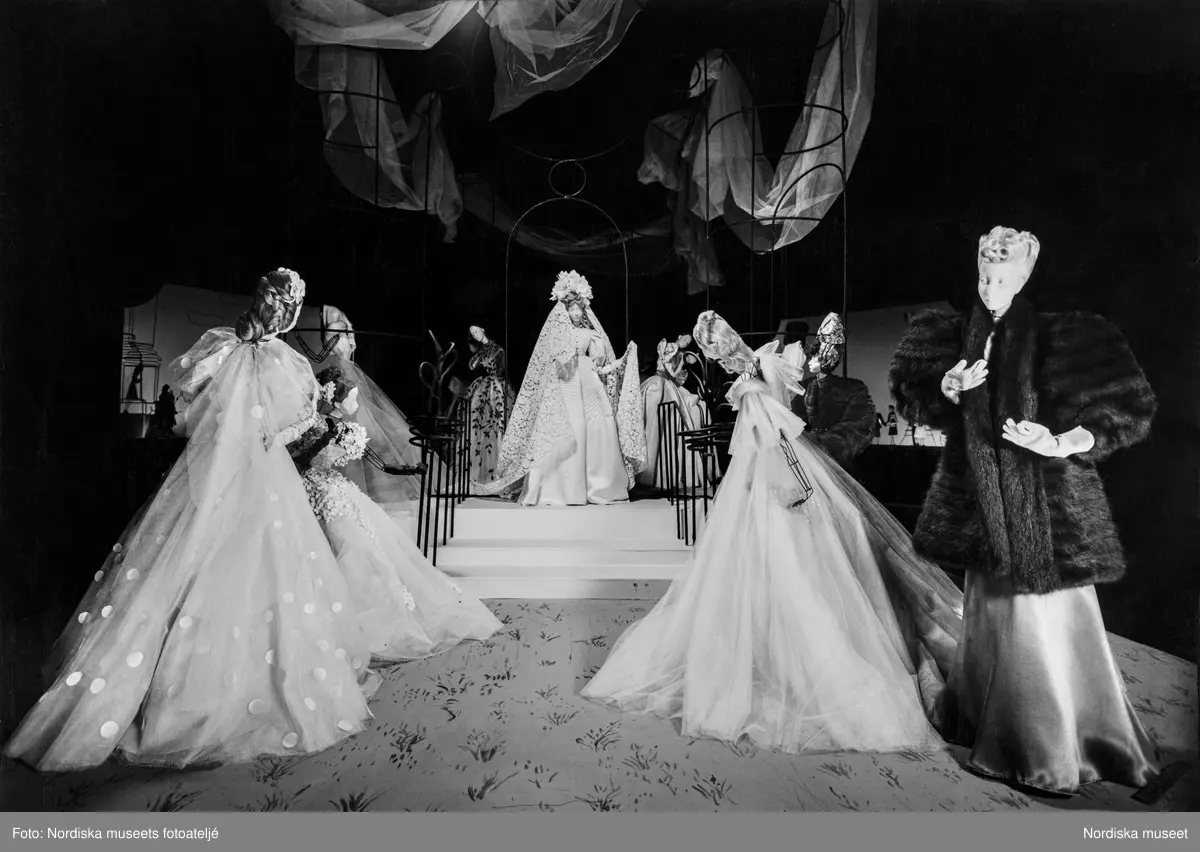 Tillfällig utställning i Nordiska museet "Théatre de la Mode", 10/10-10/11 1945. Den internationella vandringsutställningen blev Parismodeskaparnas come back efter andra världskriget. I museets stora hall visades 45 av utställningens ursprungligen närmare 200 haute couture-klädda ståltrådsdockor.