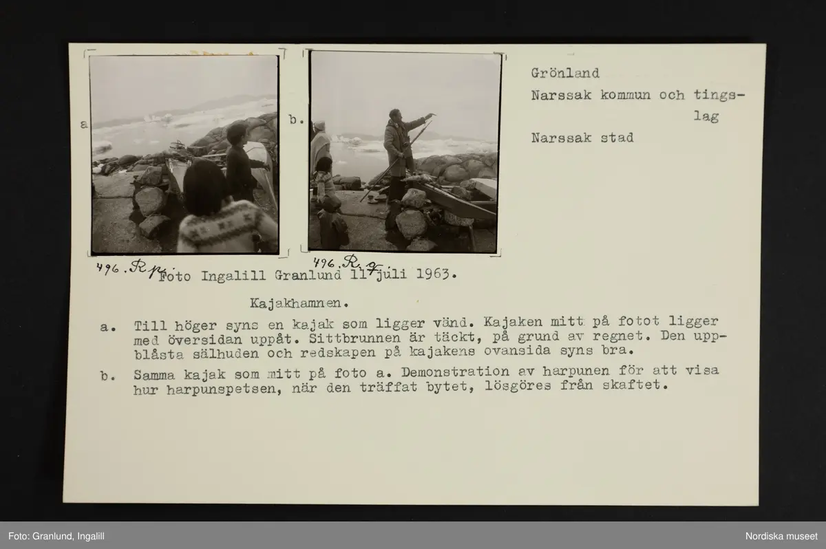 b. Samma kajak som mitt på foto a. Demonstration av harpunen för att visa hur harpunspetsen, när den träffat bytet, lösgöras från skaftet."