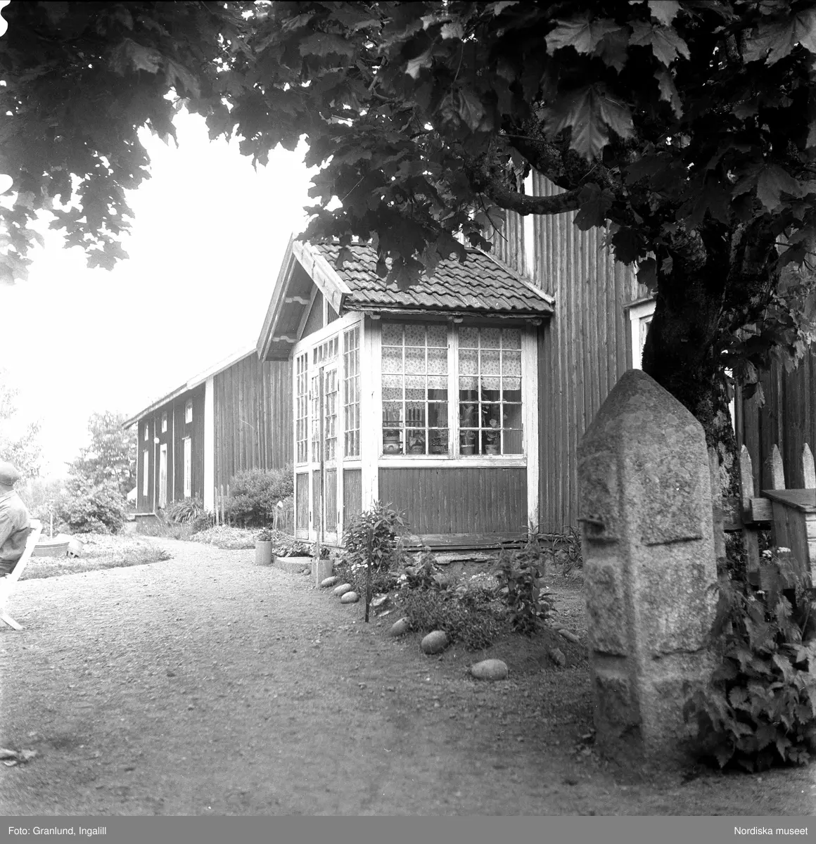 Bostadshus i byraden i Kullarp, Ydre härad, Östergötland. I förgrunden en gridstolpe av sten och ett träd. I vänsterkant anas en man sittande på en trädgårdsstol.