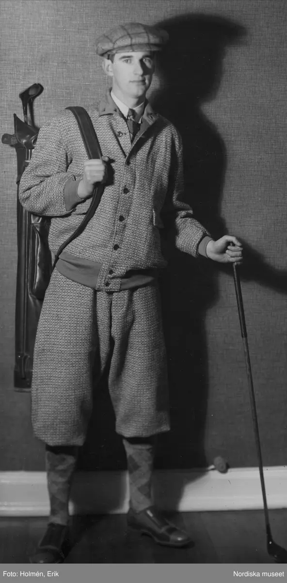 Herrmode. Kläder för sport. Man med golfbyxor och golfklubbor. Nordiska Kompaniet.