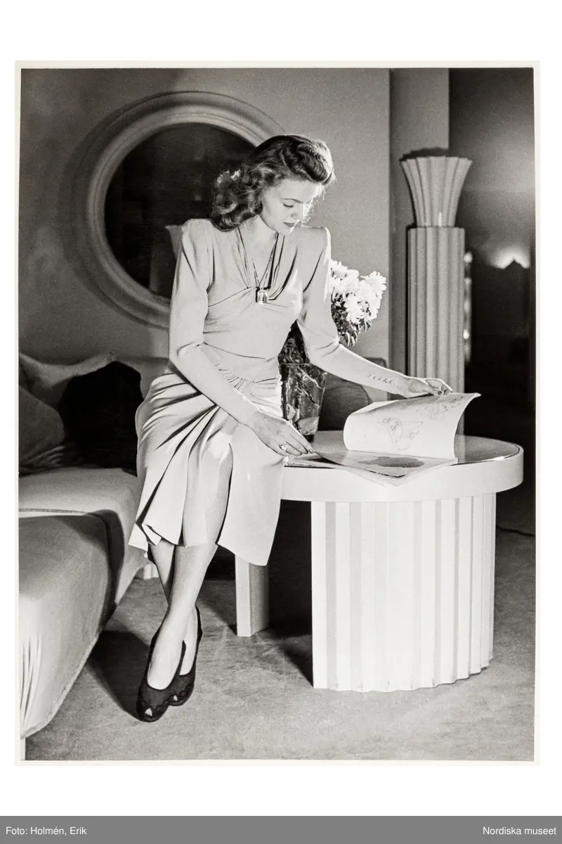 Mannekäng poserar sittande på ett bord. Hon är iklädd klänning med markerad midja och lång ärm. Draperingar vid byst och midja. Runt halsen en kedja med stor sten. Hon bläddrar i en katalog. NK:s Franska damskrädderi.