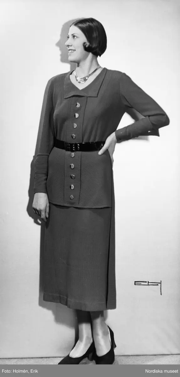 Konfektion. Modell i kofta, kjol, skärp, pumps pch halsband.