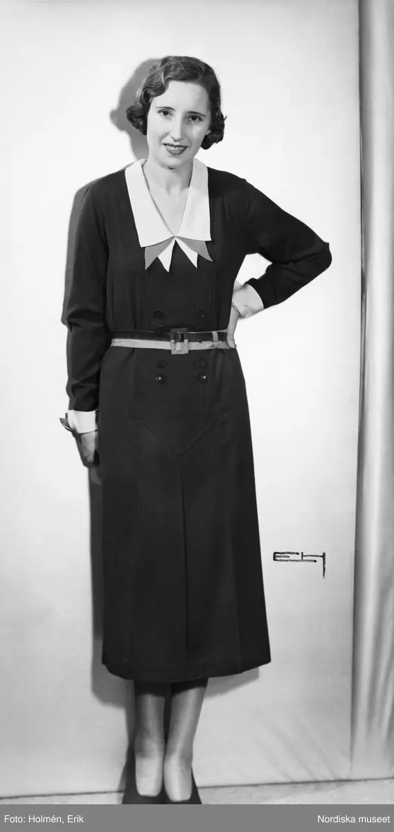 Konfektion. Modell i mörk klänning med dubbelknäppning, skärp och krage. Mörka pumps.