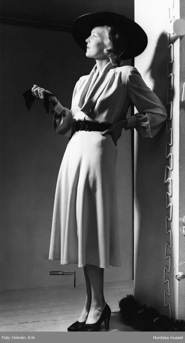 Modell i ljus sidenklänning med skärp, bredbrättad hatt och mörka pumps. Håller ett par handskar i handen.
