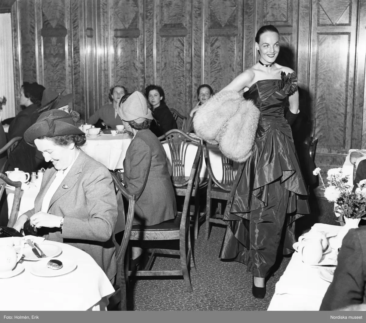 Modell klädd i aftonklänning, aftonhandskar, pälsmuff och stramt halsband poserar för åskådarna. De flesta kvinnorna i publiken bär hatt och sitter vid uppdukade bord med vita dukar och NK-servis.