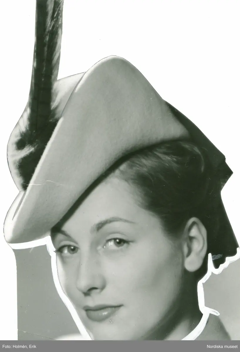 Porträtt av kvinna, möjligen modellen Hjördis Grundel-Starenius, i hatt med fjäder.