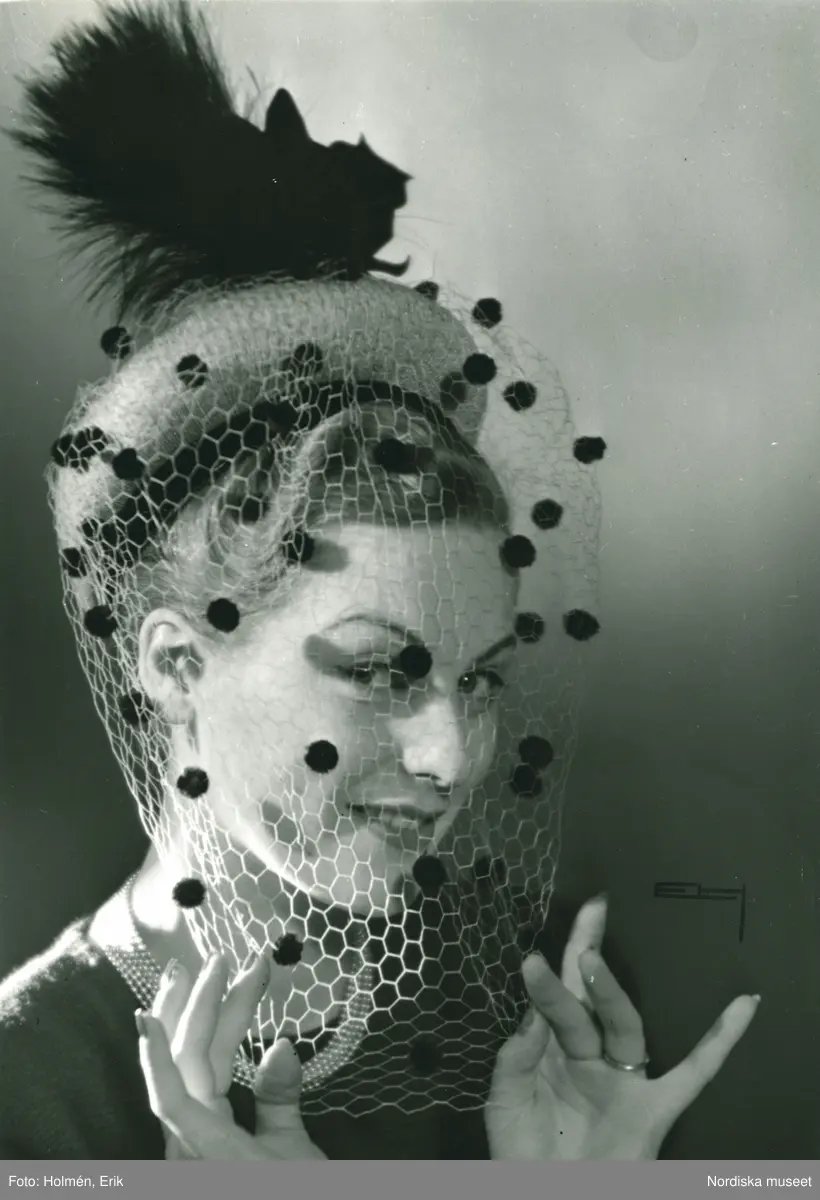 Porträtt av kvinna i hatt av Suzanne Talbot. Gul stråfjäder med svart sammetsgarnering, svart crasse, samt gult flor med svarta moucher. Uppvisning mars 1947. Hattar använda vid franska avdelningen.