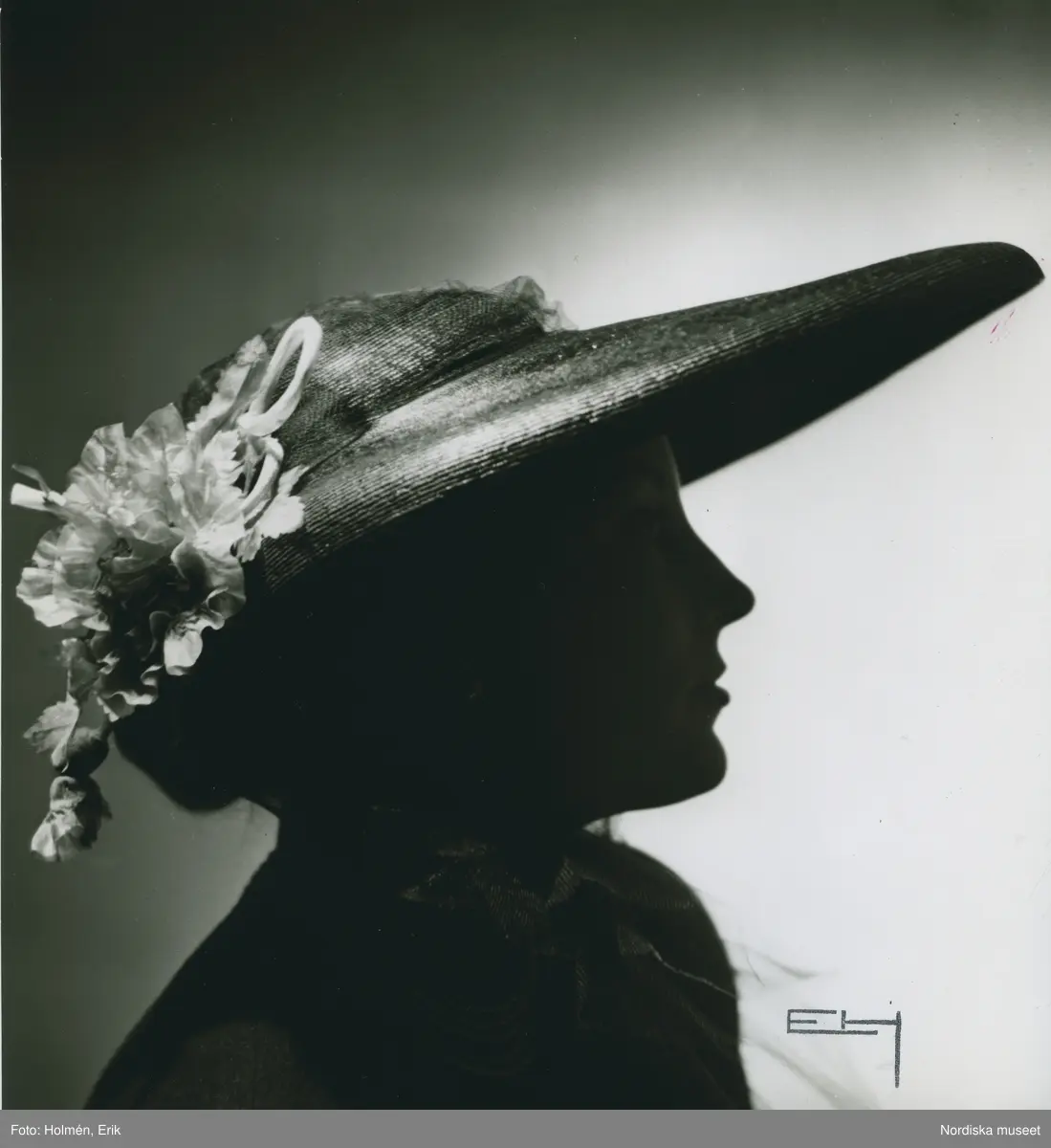 Porträtt av kvinna i svart stråflätat hatt monterad med grön blomma. Modell av Claude Saint Cyr.