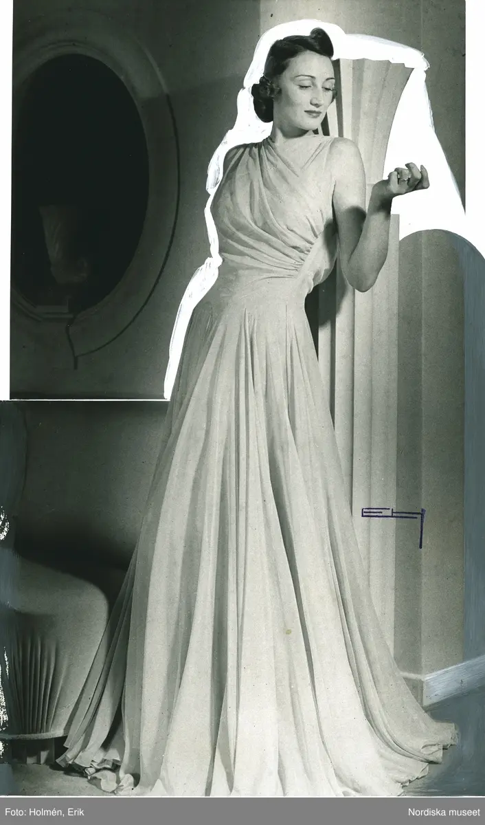 Helporträtt av kvinna i draperad aftonklänning .