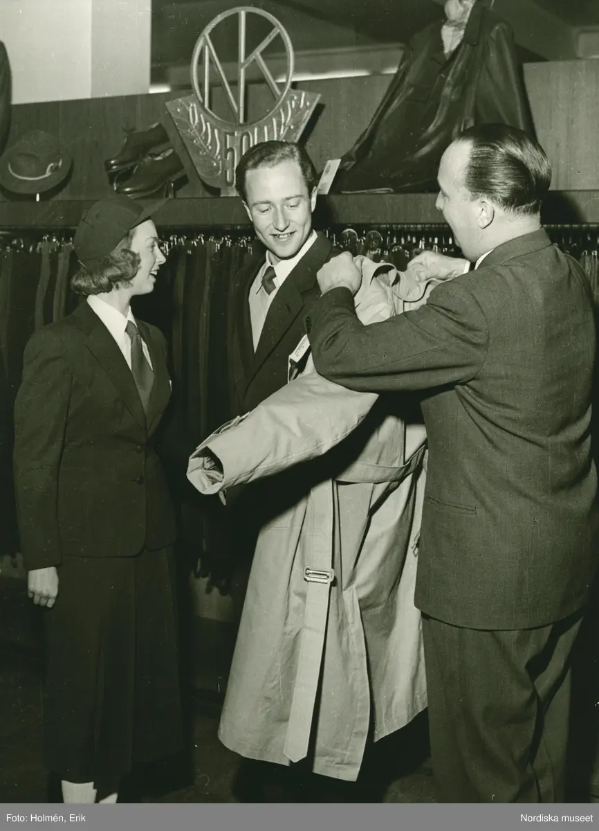 En man provar trenchcoat på Nordiska Kompaniets herrkonfektionsavdelning.