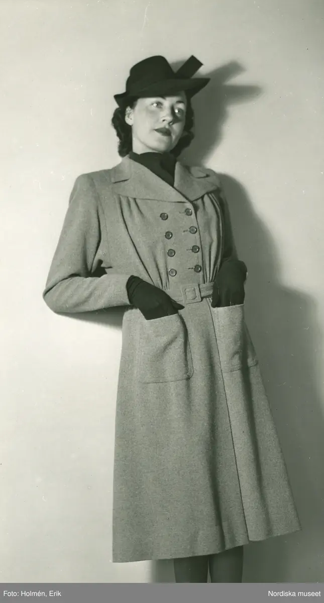 Porträtt av en kvinna i kappa, hatt och handskar.