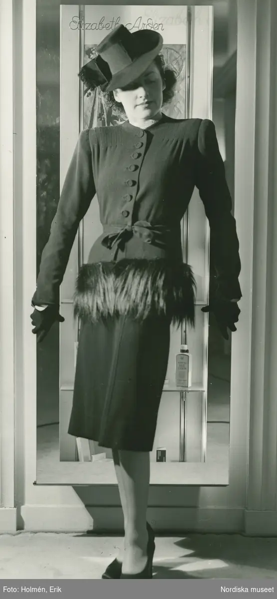 Helporträtt av kvinna i dräkt med pälsdetalj och hatt.