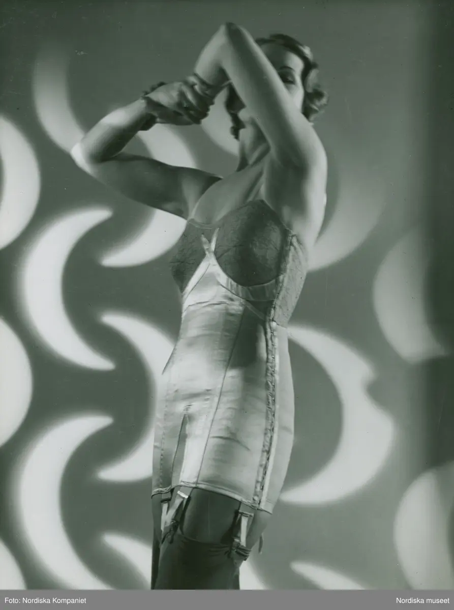 Kvinna i korsett och strumpor. Nordiska Kompaniet. Text med blyerts på baksidan: "Korsetter"