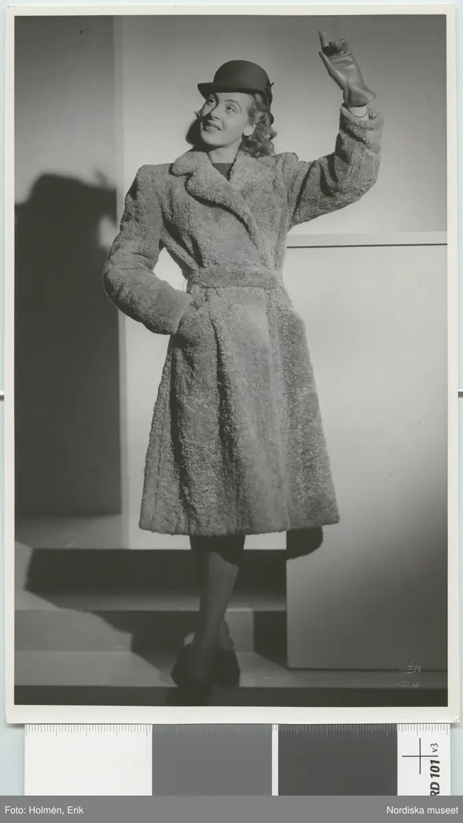 Nordiska Kompaniet. Kvinna i ljus päls med skärp, svart hatt. Text på baksidan: "Arkivbild d. 21/8 45"
