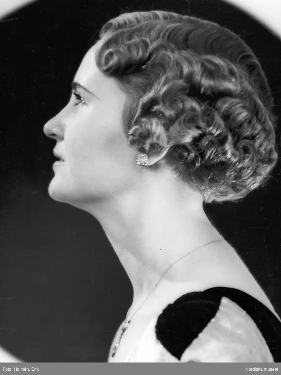 Fru M. Oldenburg i lagd frisyr, örhänge och halsband.