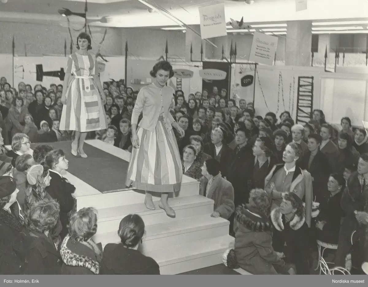 Tonårsmode. Modevisning. Två modeller i randig klänning och kjol.