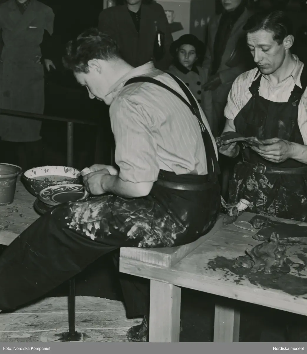 Nordiska Kompaniet. Två krukmakare arbetar inför publik. Till vänster dekoreras ett fat med piplera med hjälp av ett kohorn. Text med blyerts på baksidan: "Utställning. Skånskt och Halländskt krukmakargods 1941".